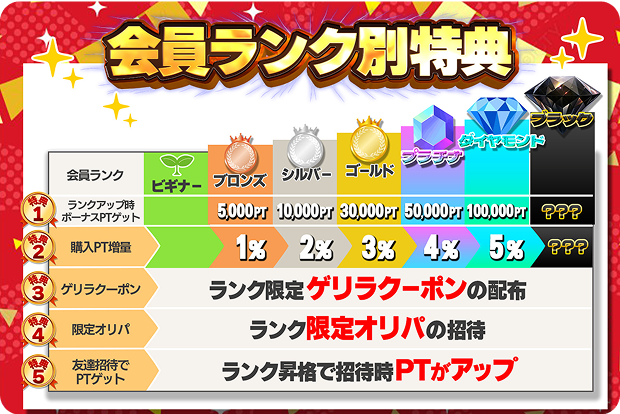 会員ランク制度があると、ランクに応じてボーナスptが貰えたり限定ガチャが発生したりします。